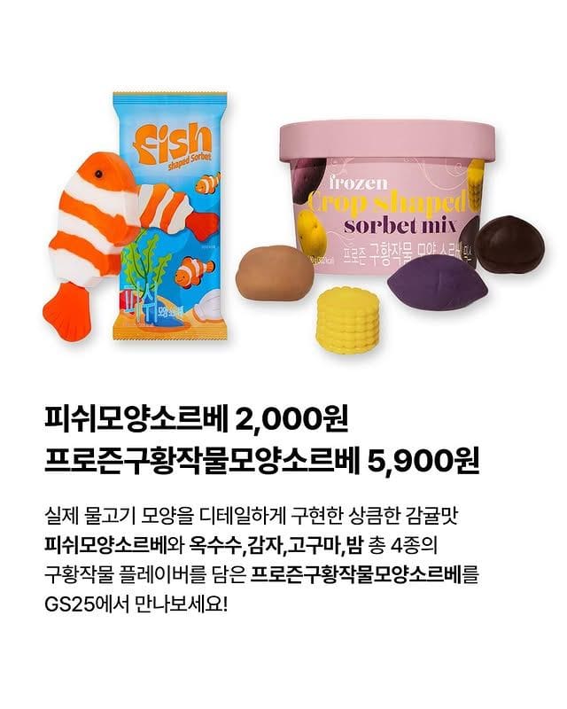 슬라임 이 소르베 모양 진짜예요..?! 🐟🍠 비주얼과 먹는 재미를 모두 잡은 신상 소르베 2종이 출시되었습니다! #피쉬모양소르베 물고기 모양을 그대로 살린 귀여운 비주얼에 시원하고 상큼한 감귤 플레이버가 가득! 🍊✨ #구황작물모양소르베 옥수수, 감자, 고구마, 밤이 시원한 소르베로 변신했어요! 🌽🥔🍠🌰 진하게 느껴지는 구황작물 고유의 고소한 맛을 즐겨보세요. 지금 바로 가까운 GS25에서 이 이색적인 맛을 PICK 해보세요! (๑•̀ᴗ•́)و-☆ 🐟피치)피쉬모양소르베 75G 2,000원 🍠피치)프로즌구황작물모양소르베 5,900원 #GS25 #GS25신상 #피쉬모양소르베 #구황작물모양소르베 #이색디저트 #편의점신상 #소르베추천 #아이스크림신상 #먹스타그램 #비주얼맛집 #디저트추천 #구황작물덕후 #감귤소르베 #편의점꿀템 #신상리뷰 #간식시간